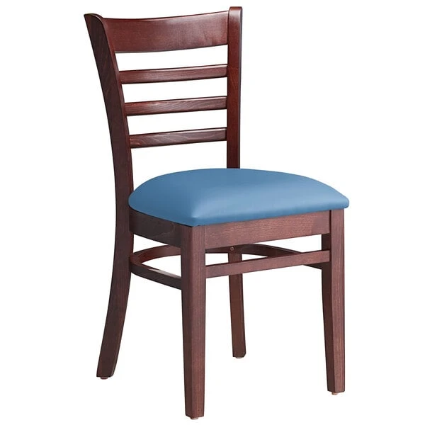 Lancaster Table & Seating Mahogany Finish Wooden Ladder Back Chair With Blue Padded Seat