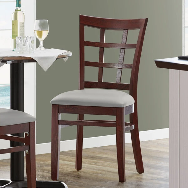 Lancaster Table & Seating Mahogany Finish Wooden Window Back Chair With Light Gray Padded Seat
