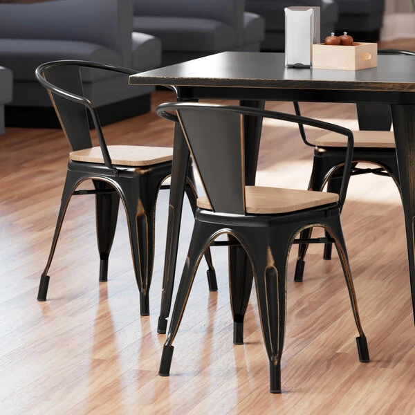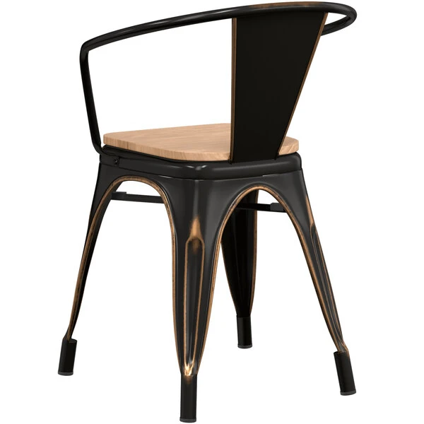LT&S Alloy Series Lancaster Table & Seating Alloy Series Distressed Copper Metal Indoor Industrial Cafe Arm Chair With Natural Wooden Seat