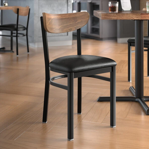 LT&S Boomerang Series Lancaster Table & Seating Boomerang Black Finish Chair With 2 1/2″ Black Vinyl Padded Seat And Vintage Wood Back