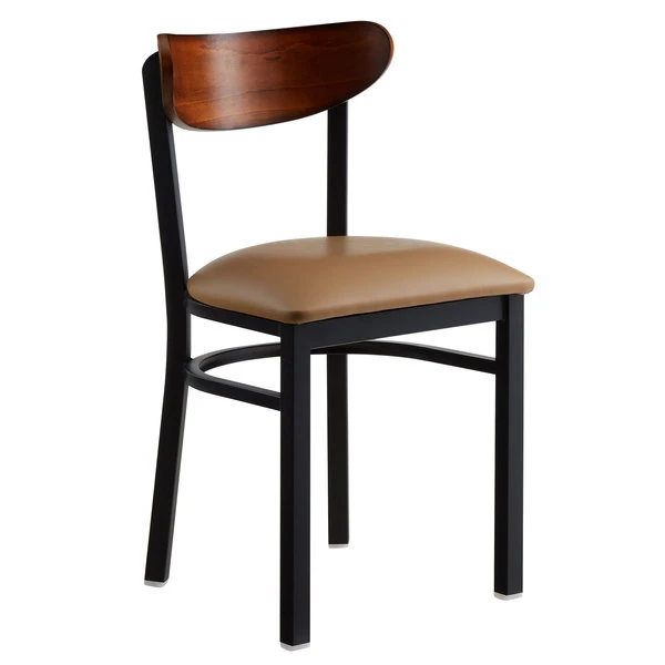 LT&S Boomerang Series Lancaster Table & Seating Boomerang Black Finish Chair With 2 1/2″ Light Brown Vinyl Padded Seat And Antique Walnut Wood Back