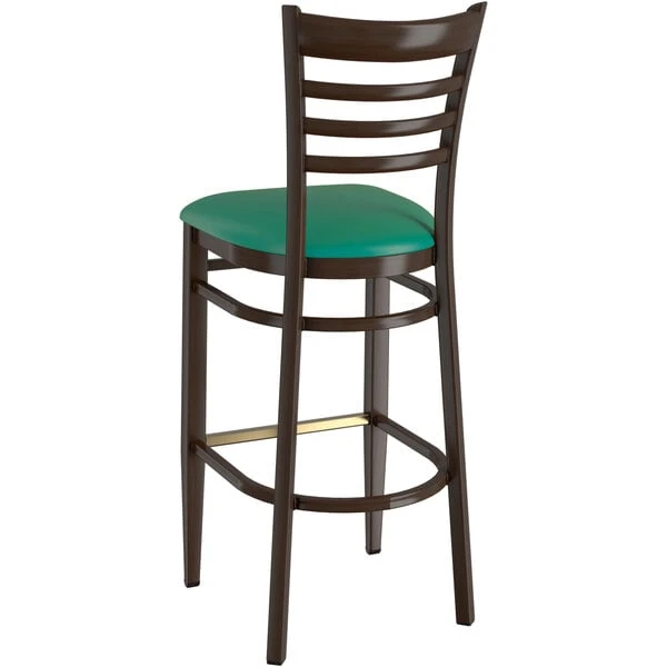 LT&S Spartan Series Lancaster Table & Seating Spartan Series Bar Height Metal Ladder Back Chair With Walnut Wood Grain Finish And Green Vinyl Seat