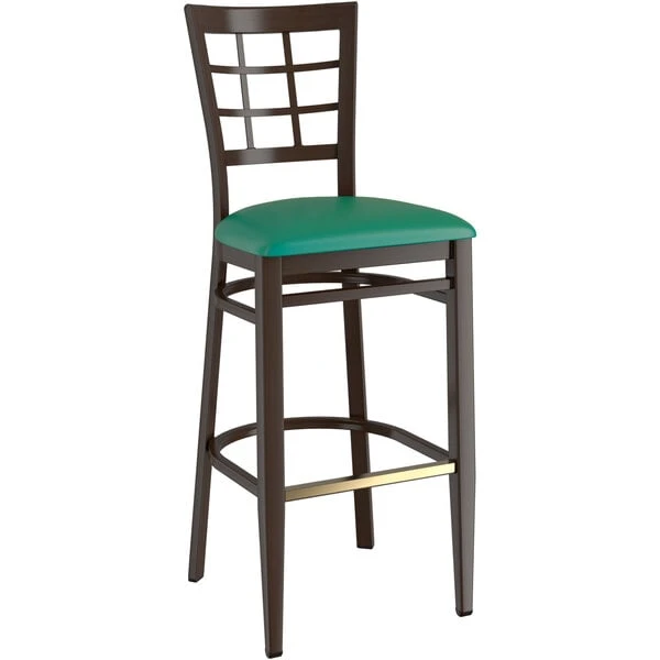LT&S Spartan Series Lancaster Table & Seating Spartan Series Bar Height Metal Window Back Chair With Walnut Wood Grain Finish And Green Vinyl Seat
