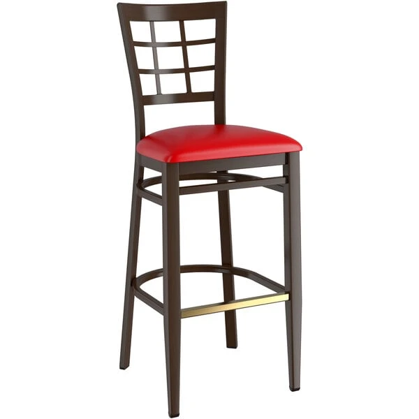 LT&S Spartan Series Lancaster Table & Seating Spartan Series Bar Height Metal Window Back Chair With Walnut Wood Grain Finish And Red Vinyl Seat