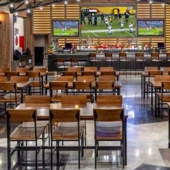 BFM Seating Marietta Sand Black Steel Window Back Chair With Relic Chestnut Melamine Seat